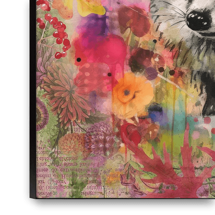 Colourful mixed media art with hedgehog and autumnal floral elements. The image shows a mischievous hedgehog framed by autumn leaves. The mixed media technique combines different techniques and materials, giving the motif a lively texture and depth. The bright colours and the organic arrangement of the flowers give the painting a…