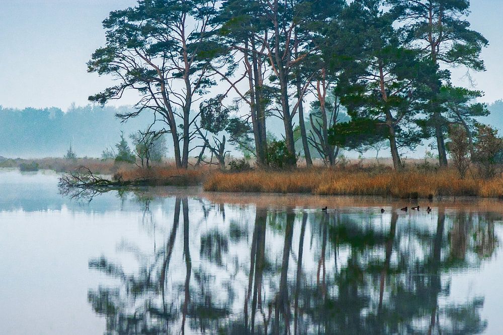 Weerspiegeling in een heideven in National Park Dwingelderveld Drenthe