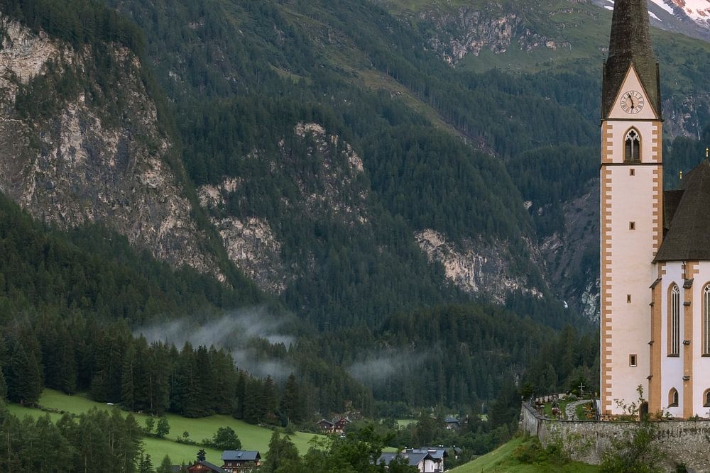 A view of the famous pilgrimage church of Heiligenblut, during sunrise. The first rays of sunlight hit the peaks of the Großglockner massif, on an early summer morning.
