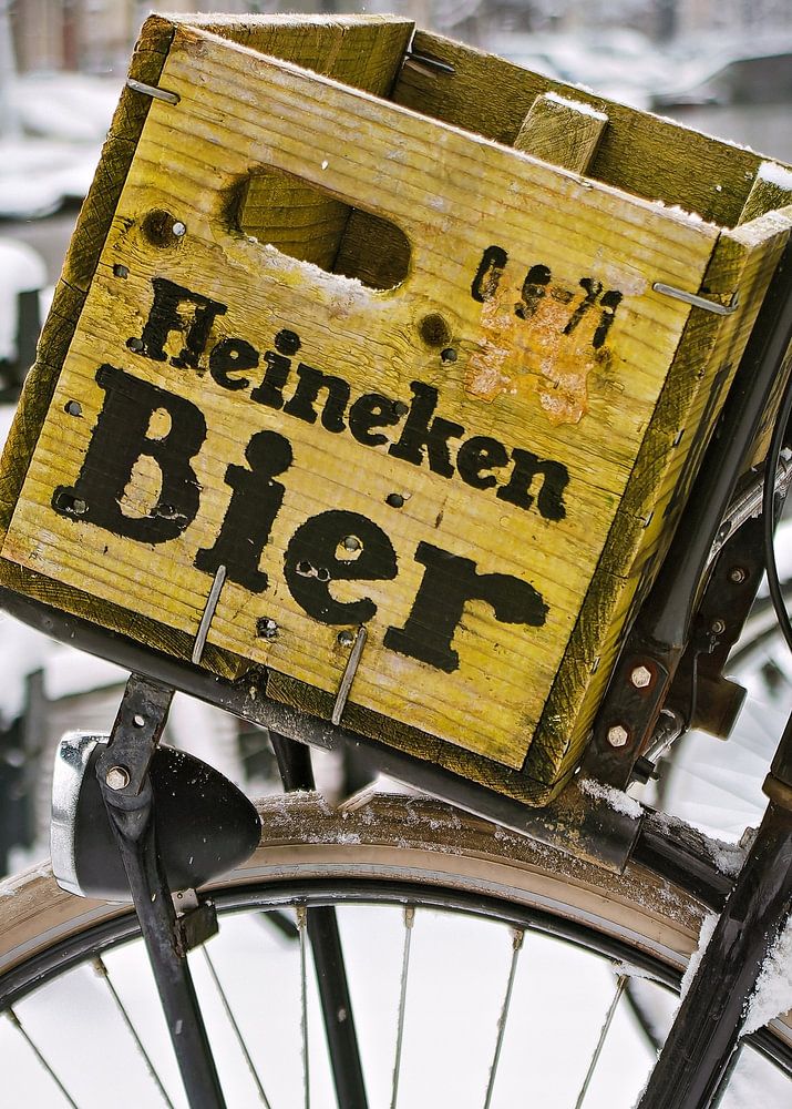 A weathered wooden Heineken crate on the front carrier of an old bicycle, on a quiet Amsterdam canal covered in snow, with classic canal houses in the background. The bike is covered in a thin layer of snow. A nostalgic Amsterdam picture!
