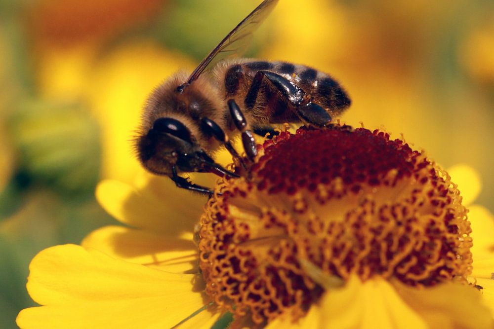 Yellow Helenium flowers with bee, a real summer picture. Heat from the sun and hum of flying insects. Flowers rich in nectar full of life and beautiful colors, swaying in a gentle breeze.
