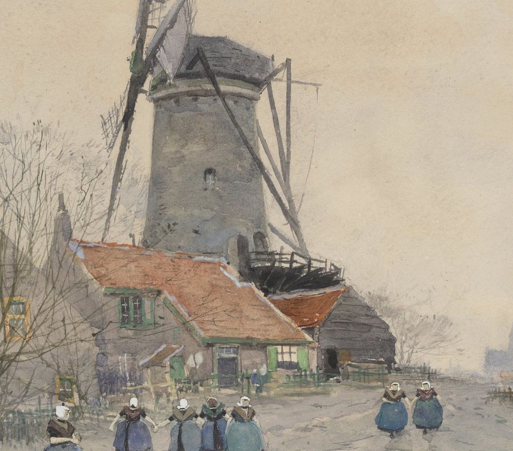 City view of the town of Axel in Zeeuws-Vlaanderen. A watercolour showing a windmill and women on the street in traditional costume.
