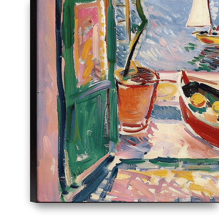 The artwork "Open Window" captures the radiant light of the south of France and shows a view through an open window. The vibrant colours and dynamic composition are reminiscent of Henri Matisse's characteristic style, known for his masterful use of colour and his preference for simple, expressive forms.