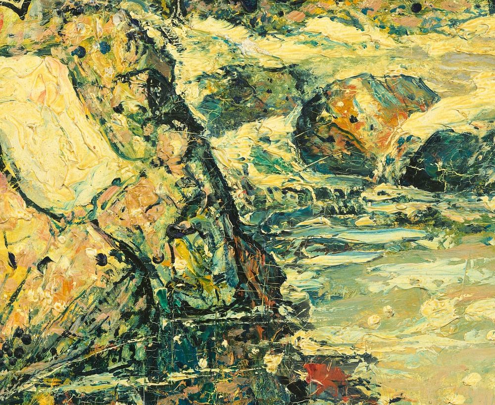 "Flecks of Foam" by Henry Golden Dearth, painted around 1912, depicts a vivid coastal landscape. The painting is rich in texture and colour, with an impressionist style that captures the dynamism of the sea and coastline. A red and white parasol can be seen in the foreground offering shade on the rocky shore. The rocks are covered in colourful patches and the foam of the waves splashes against the shore. The sea itself is a mixture of shades of green and blue, with white foam heads suggesting the movement of the water. In the distance, a coastline is visible under a slightly cloudy sky. The painting is interesting for its expressive brushstrokes and use of colour to capture the energy and beauty of nature.