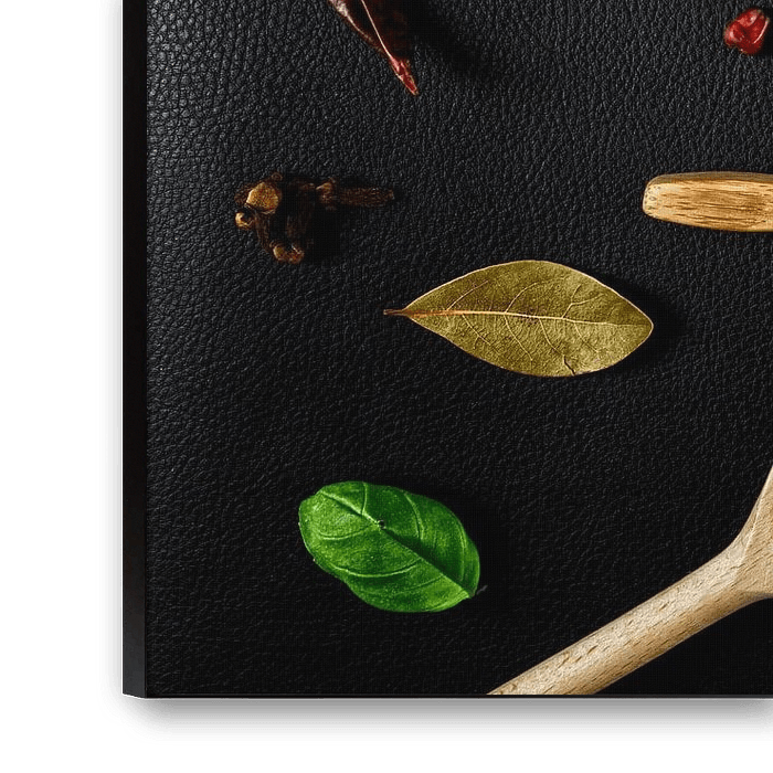 Various colourful herbs and spices with wooden ladles and vintage teaspoons on a piece of black leather. Star anise, Chili pepper, cinnamon sticks, pink peppercorns, cloves, mustard seeds, Costiera spice mix, fennel seeds, coriander seeds, four-season peppercorns, Szechuan pepper,bay leaves, Chia seeds, Pili-Pili, fresh basil and fresh thyme.