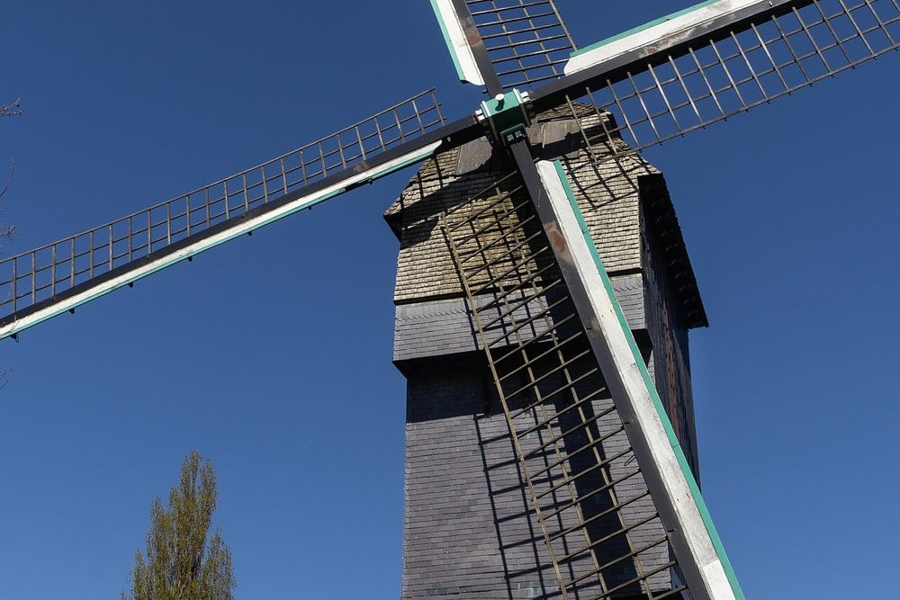 The lovely old Hertboomwindmolen (windmill) in Roosdaal between Gooik and Ninove, in the Flemish Pajottenland, in Belgium. Captured on a beautiful spring day against a background of clear blue sky. The mill is also known as the Tragic Mill. In the 1960s, the mill gained national fame for serving as the home for the youth serial “Captain Zeppos”.