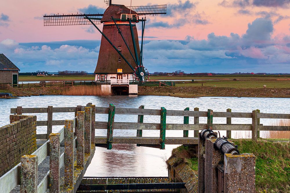 Mill in Dutch polder landscape. Dutch landscape. The cap of polder mill "Het Noorden" near Oosterend on the Wadden island of Texel is coloured red by the sunlight from the rising sun. Molen Het Noorden is an octagonal mill and its purpose was to drain the polder located north of Oosterend. The mill is now out of operation. This photo was taken on a cold Winter morning in February 2016