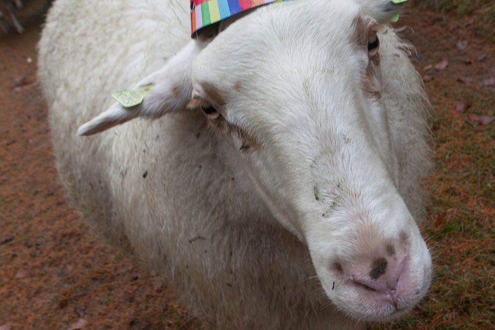 Een ooi met een feestmuts op, loopt vooruit op de kudde. Ze heeft zich altijd al bijzonder gevoeld en de feestmuts onderschrijft dit.