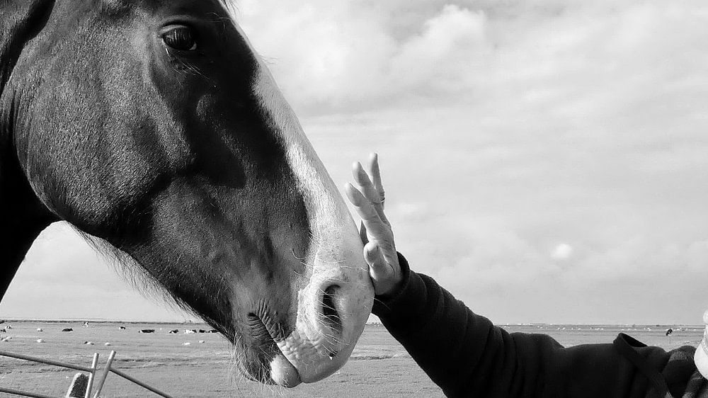 Het meisje en het paard. Beiden ontdekken elkaar en tasten elkaar af. Genomen in 2016 op de Friese kwelders.