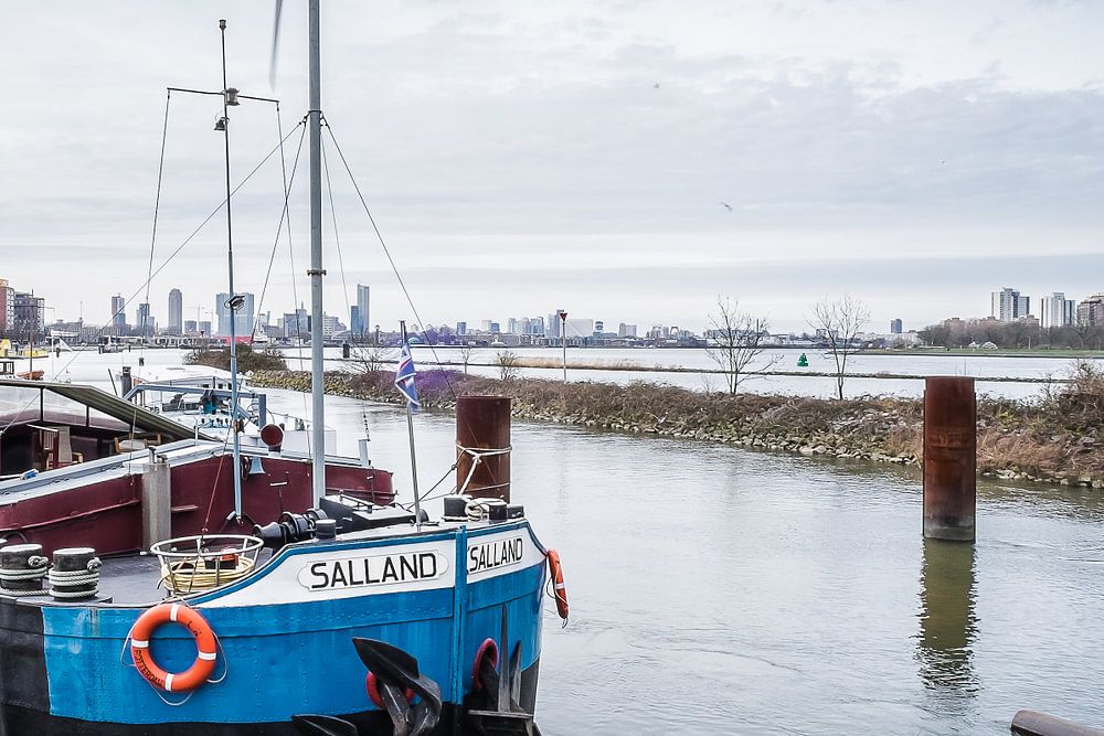 De Salland op een mooie heldere voorjaarsdag, aangemeerd bij de toegangsbrug naar het eiland van Brienenoord met Rotterdam op de achtergrond.