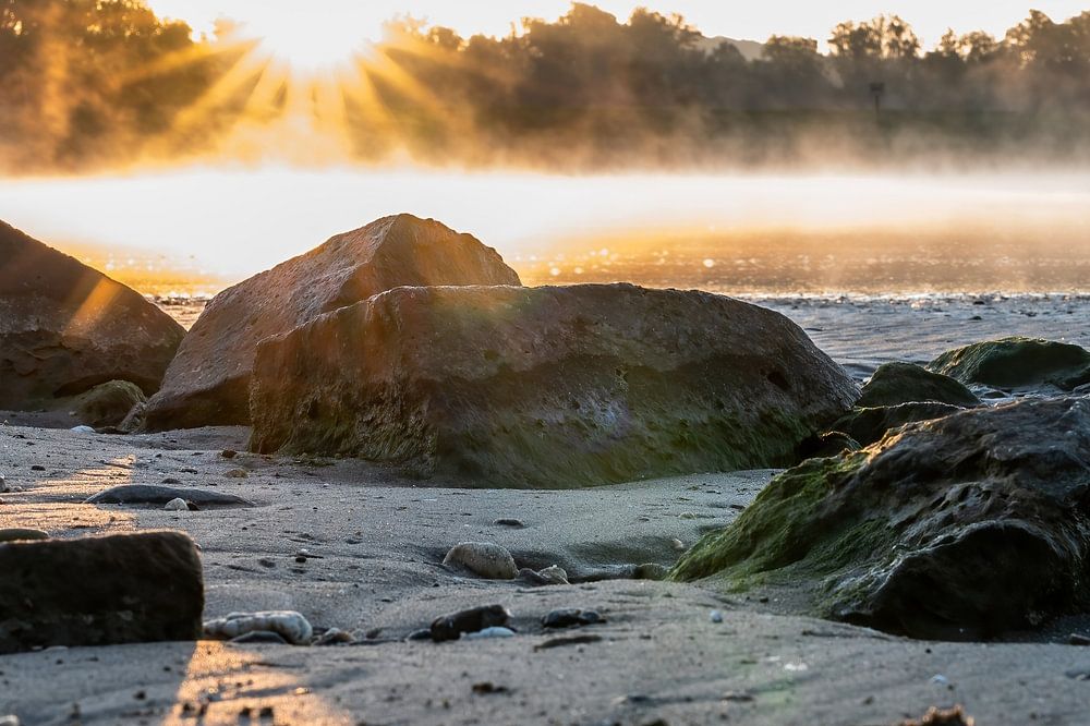 Landscape on the floodplains of Heteren, Overbetuwe in Gelderland, with a view of the sand with a nice play of lines, some rocks , the Rhine and the rising sun.