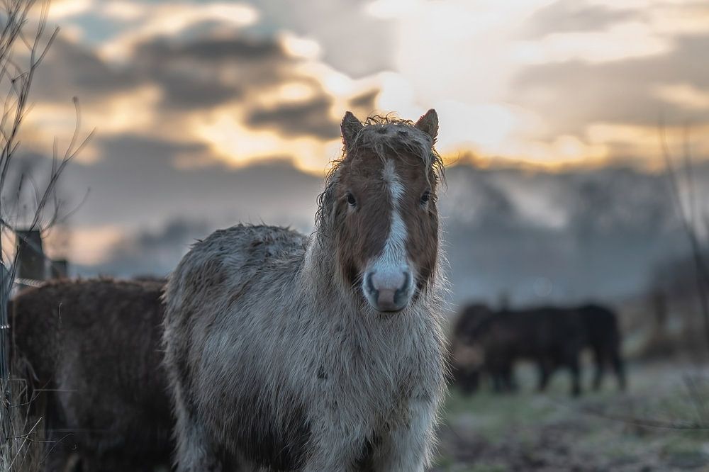 Landscape on the floodplains of the Rhine in Heteren, Overbetuwe in Gelderland, with a view of a pony under a beautifully colored cloud sky