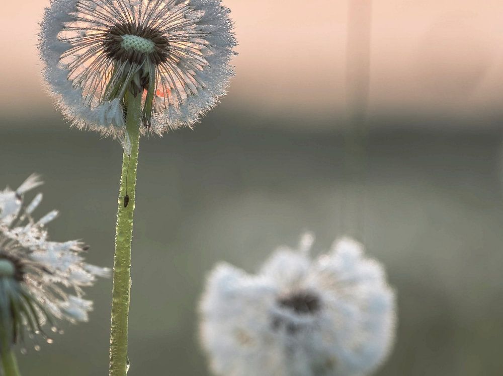 Close up of a spent dandelion, with the rising sun in the hazy background. The dandelions are on the floodplains of the Lower Rhine in Heteren.