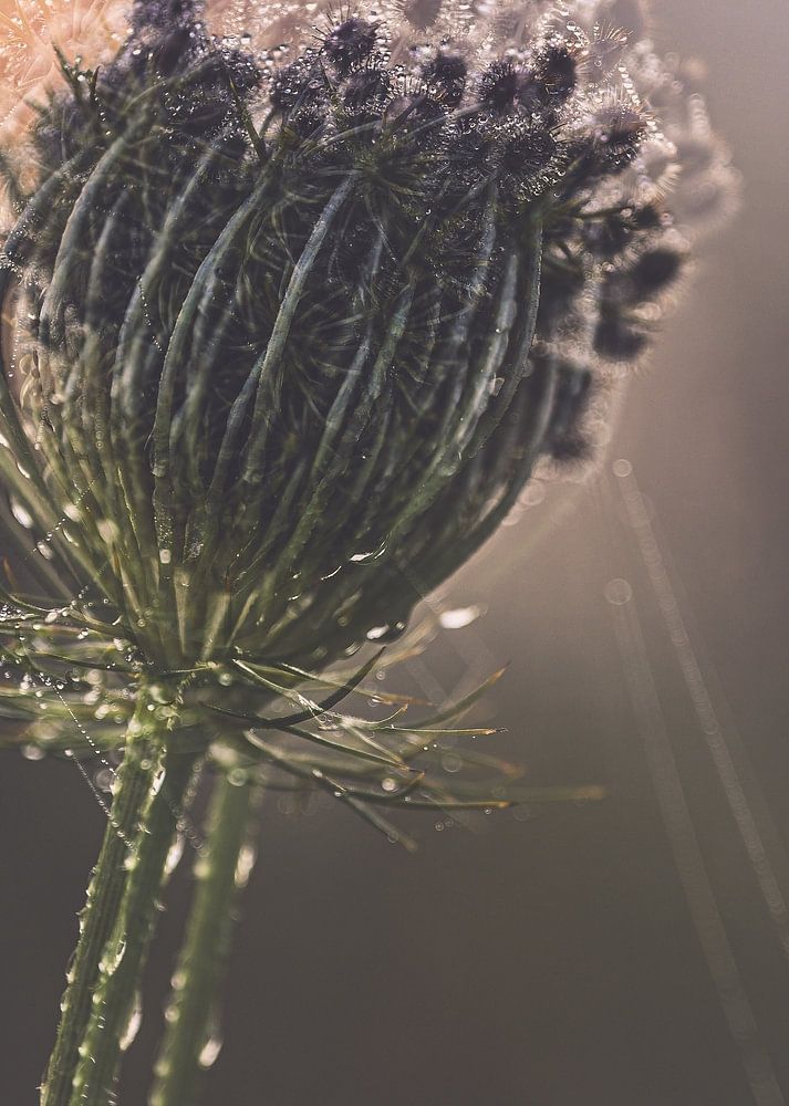 Triple close up of wild carrot, a wild-growing plant found in the floodplains of the Lower Rhine. In the background, you can see the rising sun.