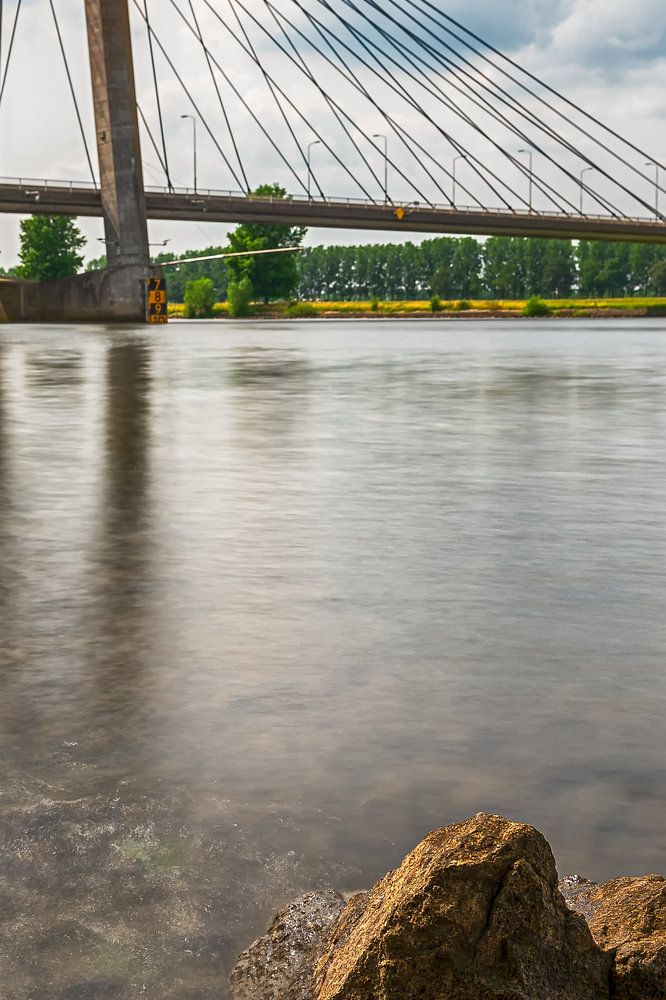 6 seconds exposure time for this rustic river landscape photo of the bridge near the fortified town of Heusden in North Brabant. In the foreground, a large rock in the river Maas.