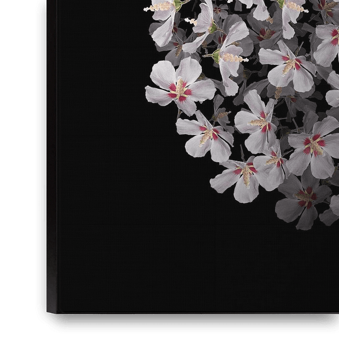 Several hibiscus flowers are brought together here to form a full ball. Nice depth and airiness, making it look like the ball is floating. White petals with a red centre.
