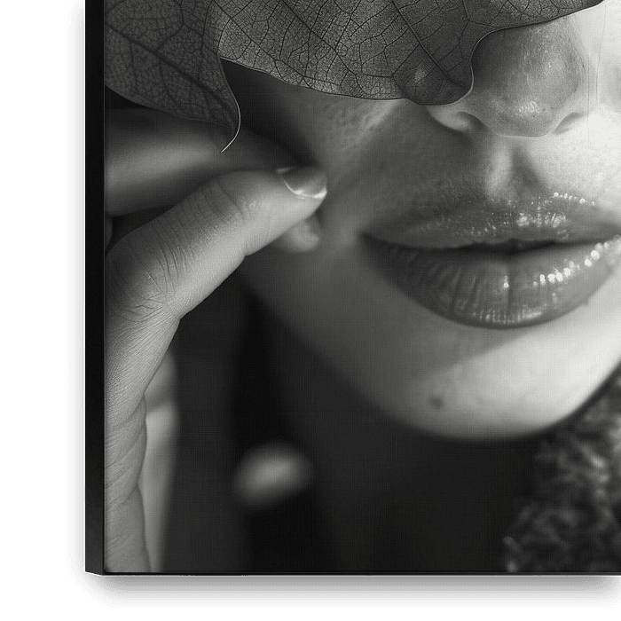 Immerse yourself in the fascinating fusion of man and nature with this impressive black and white portrait. The flawless beauty of a female face, framed by detailed leaves, draws the viewer into a surreal world in which the boundaries between nature and man blur. The finely worked freckles and the intense depth of the gaze lend the…