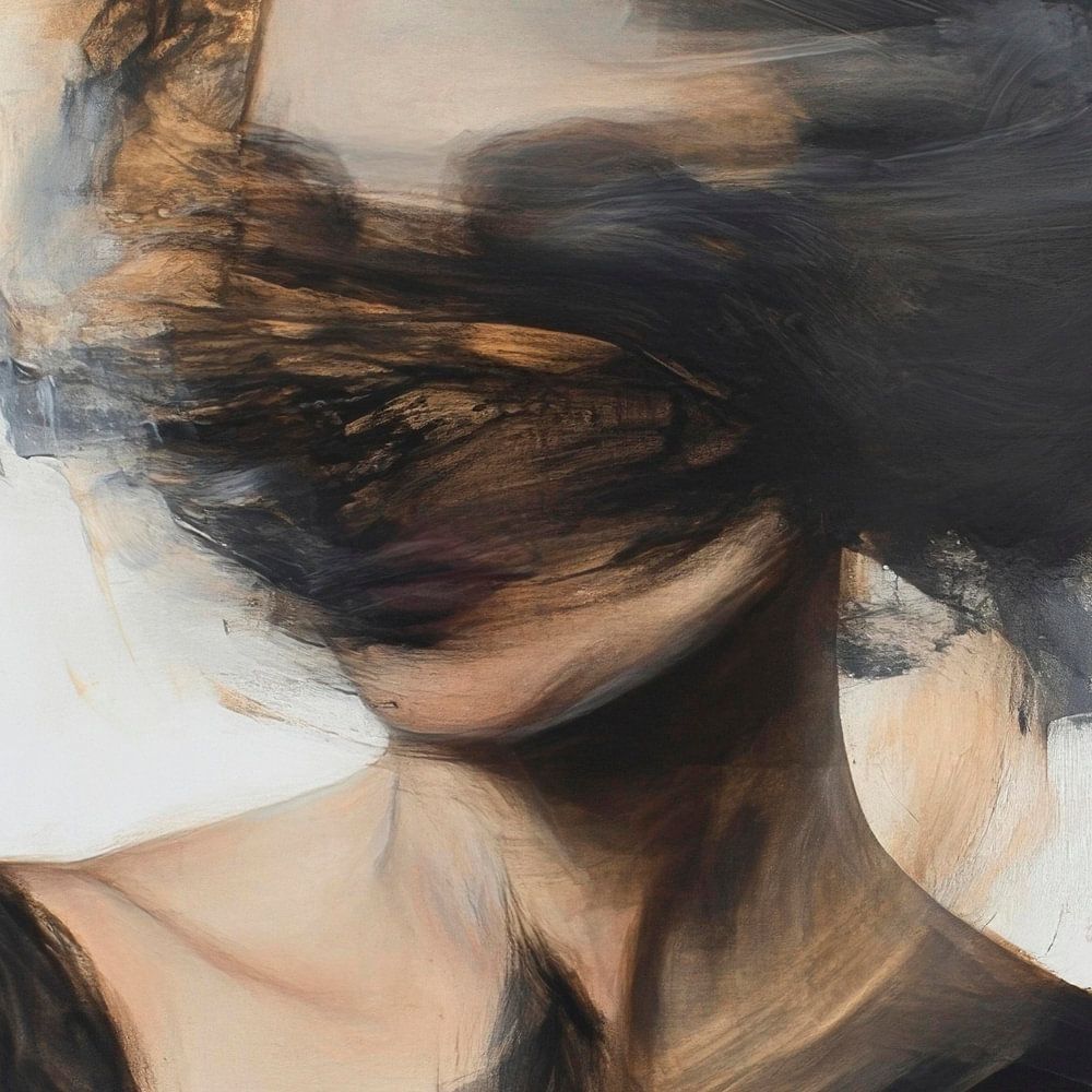 In a virtual ocean landscape full of movement and emotion, shapes and colours merge into an enigmatic portrait. The interplay of black and warm earthy tones envelops the contours, while the blurred features of the figure suggest a profound anonymity. A fascinating symbiosis of chaos and beauty that is thought-provoking.