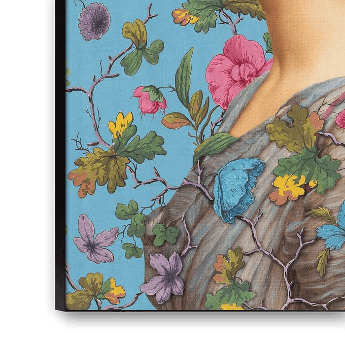 Anno 2025, I adapted the portrait into this colourful, vintage and botanical artwork, on a light blue background.