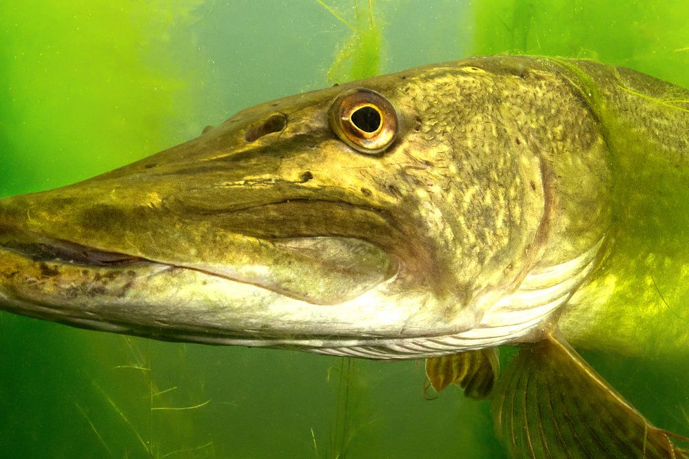 A pike is hiding between the water plants of the pond at Haarlemmermeer, The Netherlands.