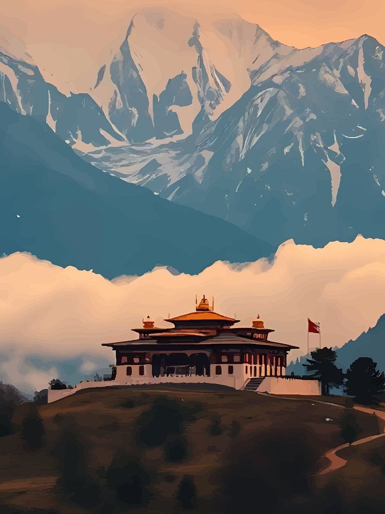 Buy this landscape artwork High Mountain Temple Overlooking the Sunset by rendy okta on canvas, ArtFrame, poster and wallpaper, printed on demand in high quality.