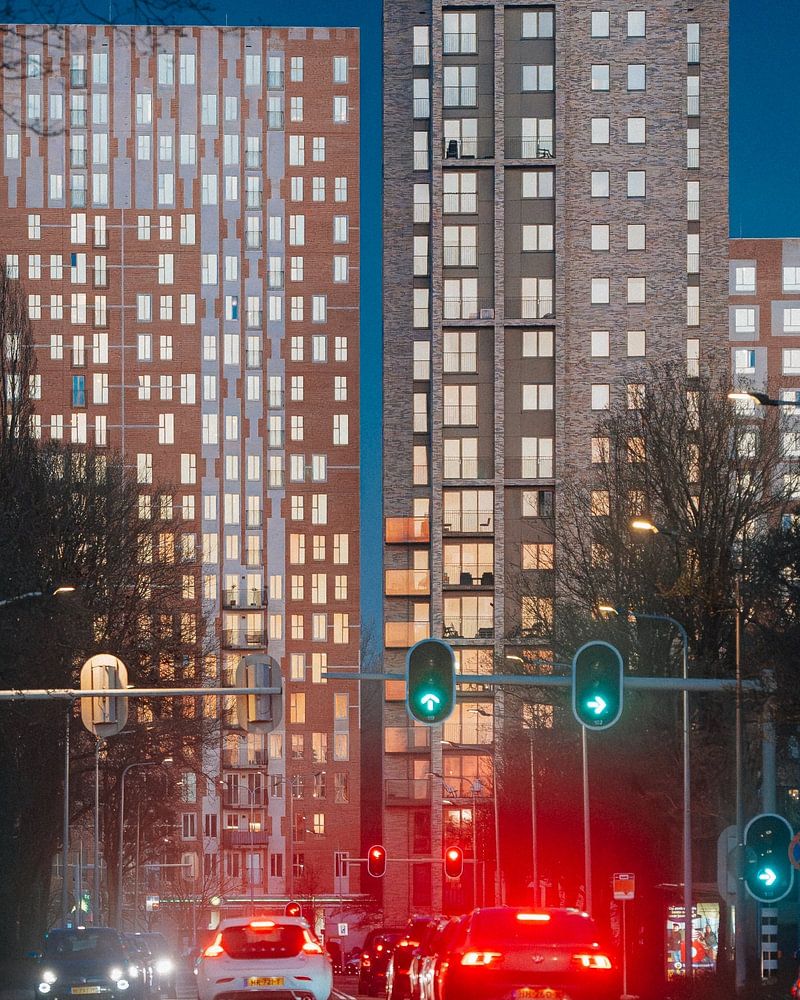 The high-rise buildings (aka House of Groningen) of Paddepoel in Groningen City during dusk with the lights and glow of the evening rush hour. The Manhattan of Groningen :)