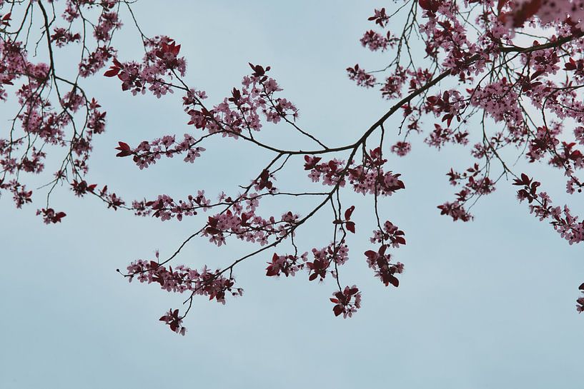 Blossom petals fluttering in the wind high up in the tree. The many blossoms on the tree in spring make for a beautiful sight. They are only there for a moment, but soon these little flowers fall from the tree and leaves begin to form.
