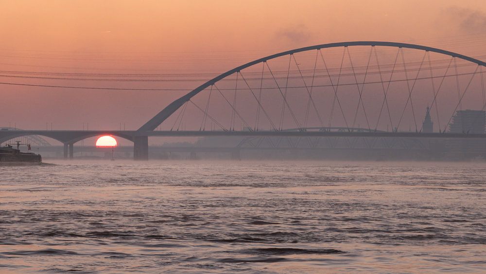 High tide on the river Waal, captured during sunrise. The Oversteek and the St. Stevenstoren can be seen in the background.