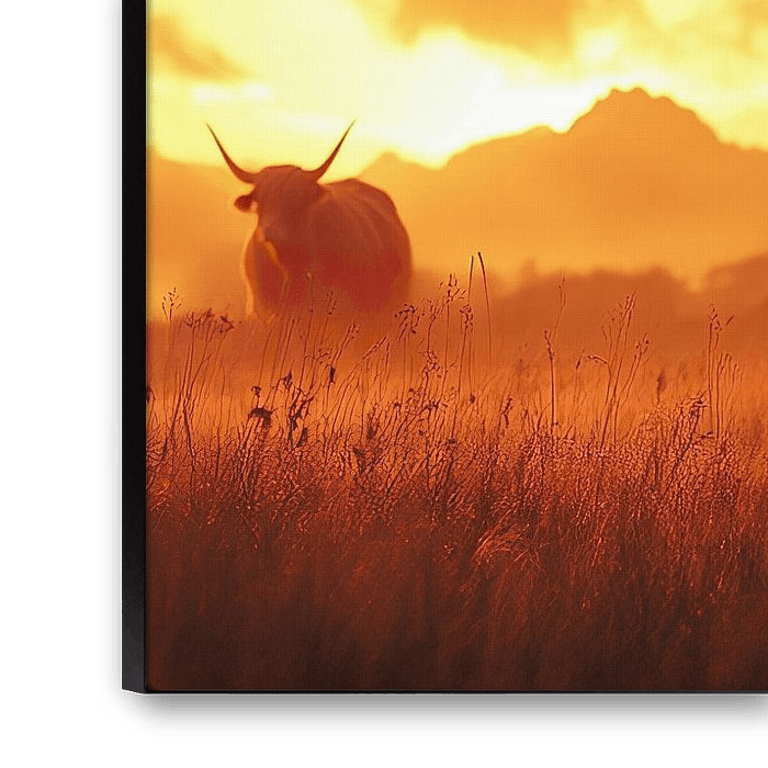 A majestic highland cow stands in the golden light of sunset, her rich brown coat shimmering in warm tones. The background is an open field with wildflowers and trees, creating a tranquil rural scene. The animal's long horns glisten as it turns towards the camera and its eyes reflect calm and depth. This photograph captures nature at its most beautiful and shows Scottish wildlife up close in all its splendour.