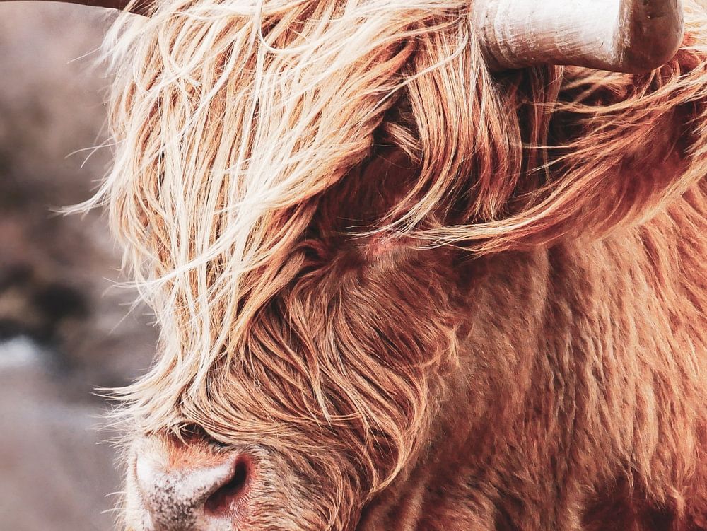 An unmistakable image; the Scottish highlander in Scotland in The Isle of Skye. This sturdy beast stood in a mountainous area and allowed itself to be photographed well.
