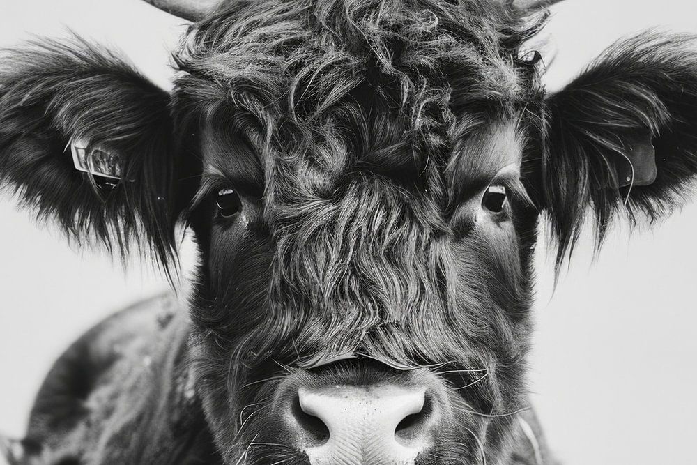 This stunning black and white photographic artwork captures the charming yet powerful presence of a Highland cow. With its fluffy coat and large, expressive eyes, the calf exudes a rustic elegance that is both calming and mesmerising. The minimalist composition and clear contrasts make this picture an ideal addition to living or office spaces that want to convey a warm, natural atmosphere. Perfect for animal lovers looking for a connection to the rural idyll and the natural beauty of the animal world.