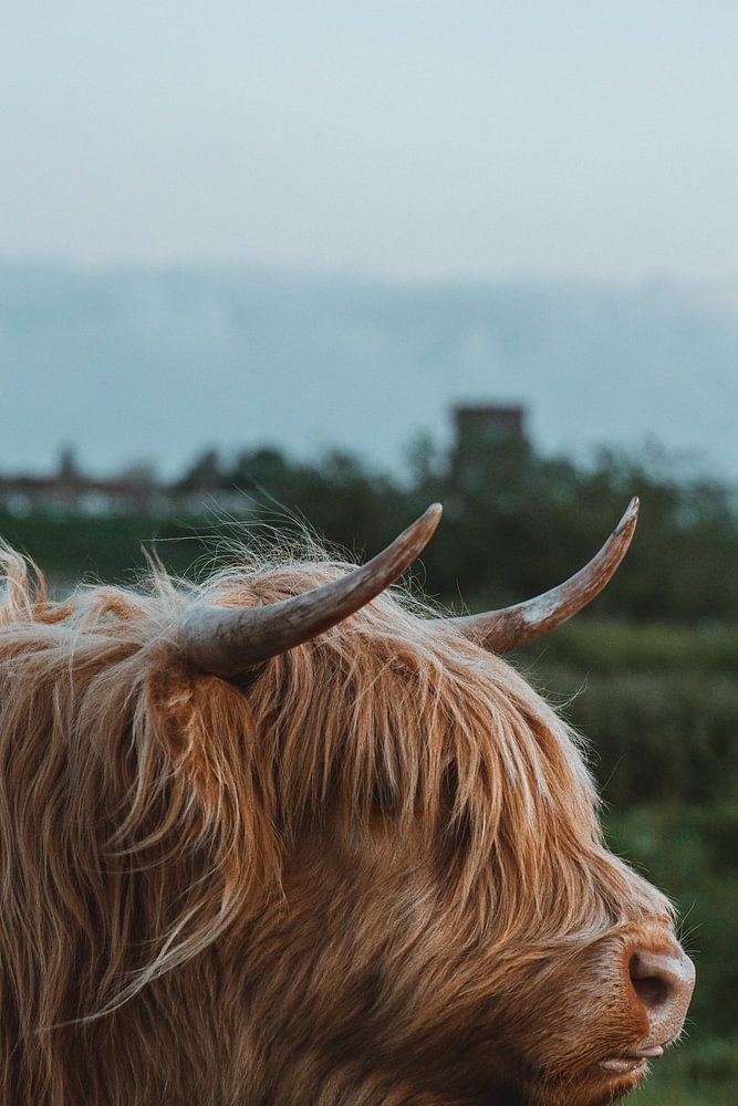 This Scottish Highlander grazes in Nijmegen near the river Waal. With its long orange hair and dangerous horns, this is a beautiful animal that looks cute but also dangerous.