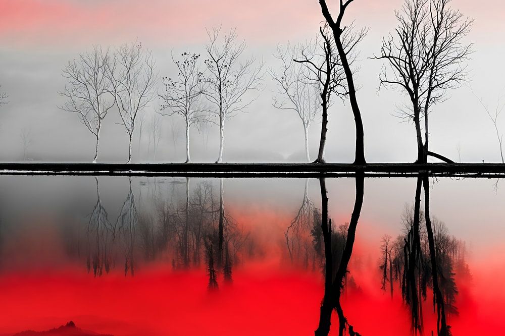 A row of bare trees is reflected in a calm body of water. A striking shade of red dominates the lower half of the picture. A solitary figure strides along the horizon, lending the misty atmosphere a sense of grandeur and loneliness.....Digital art with the use of composing, AI tools and retouching based on own reference images