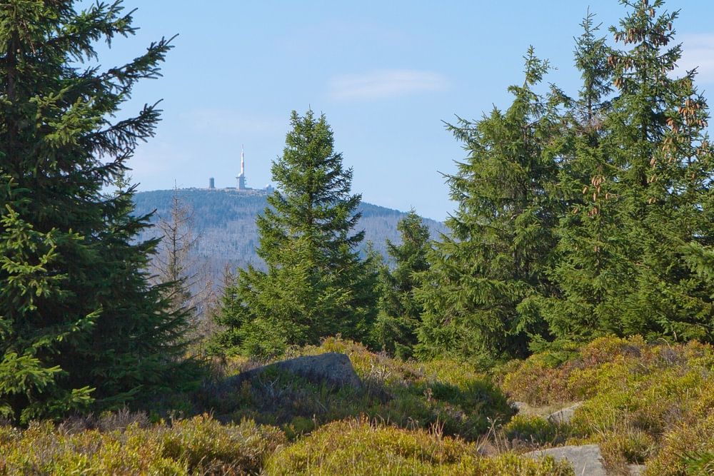 Hiking at the Hohne Cliffs in the Harz Mountains with a view of the Brocken Mountain