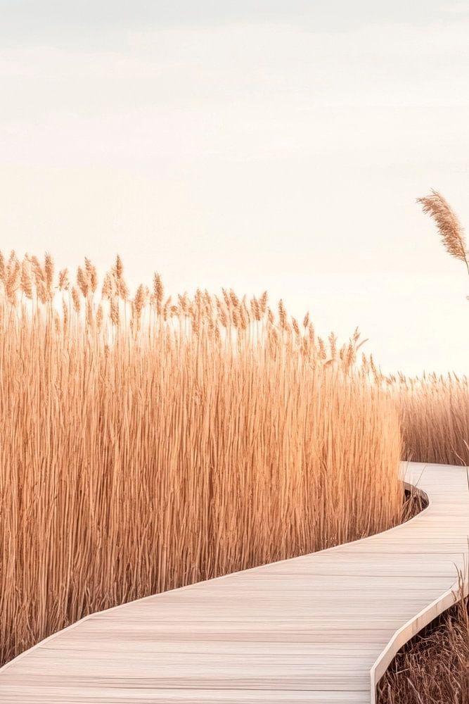 The narrow wooden walkway meanders gently through the golden reeds, which dance like waves in the gentle breeze. The sky, soft and misty, frames the scene with a touch of melancholy. This inviting route promises a quiet journey of discovery into the surrounding nature, where the journey is the destination.