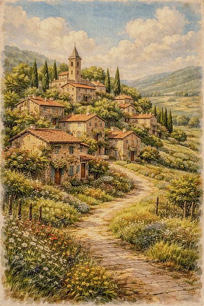 This beautiful illustration presents a charming hillside village surrounded by lush gardens and blooming wildflowers. Stone cottages with warm terracotta roofs line a winding path that leads through a vibrant countryside landscape toward a historic church tower above the village. Tall cypress trees and rolling hills frame…