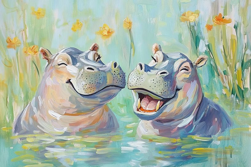 Buy this painting Hippos Smiling | Two Happy Hippos in Garden by Eye catching paintings as a reproduction on canvas, ArtFrame, poster and wallpaper, printed on demand in high quality.