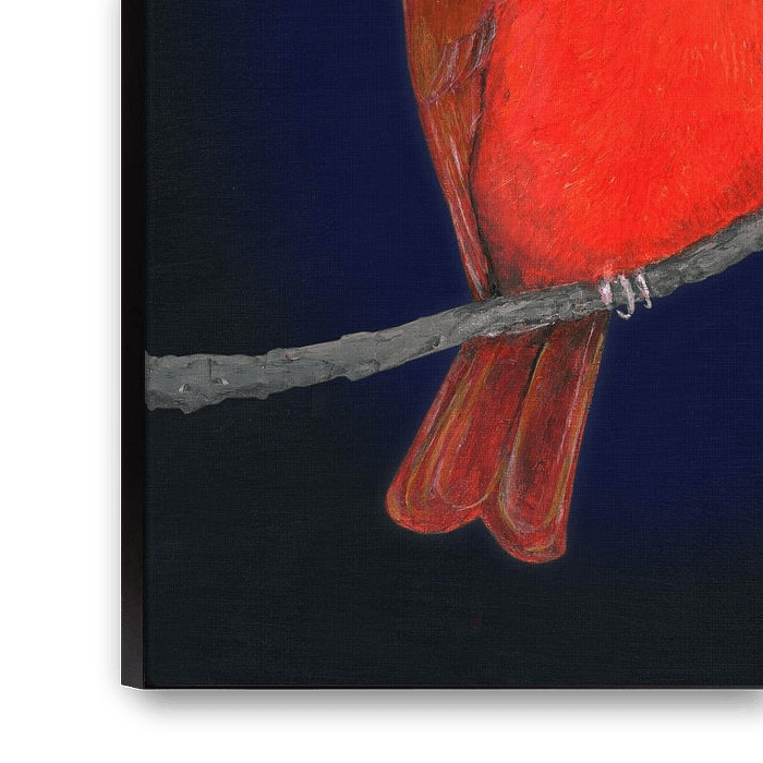 An acrylic painting of a red Cardinal. This is the bird that is common in America and has a red plumage. Because of this color, the birds have been given the name Cardinal.