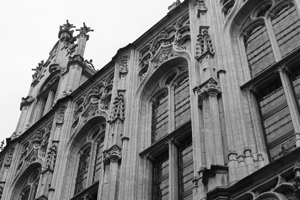 Ornate historic facade of the beautiful medieval Mechelen City Hall in the Province of Antwerp in Belgium. Black and white Palace of the Grand Council architecture.