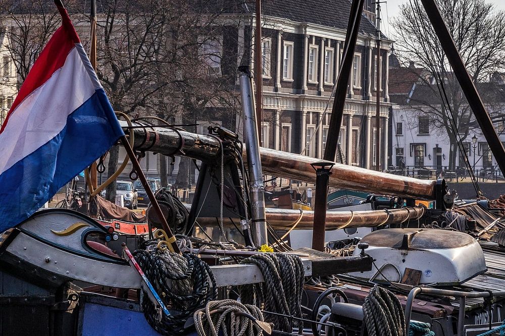 Canal with historic sailing ships in the historic core of Schiedam (Netherlands).