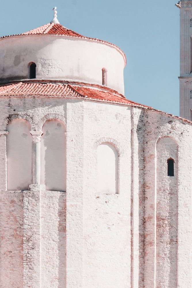 An atmospheric view of St Donatus Church and bell tower in Zadar, Croatia. The soft tones of the stone walls, combined with the warm red of the roofs and the clear blue sky, give this historical monument a timeless look.