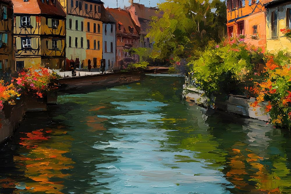 This 19th century oil painting depicts the picturesque Venise Verte district in historic Strasbourg. With clearly visible, lively brushstrokes, the painting captures the special atmosphere of this neighbourhood, where narrow alleyways and old half-timbered houses nestle harmoniously against the quiet canals. The light of day is reflected on the surface of the water and makes the colours glow - from the lush green of the riverside vegetation to the warm tones of the house facades. The composition conveys a peaceful, almost dreamy mood, while small clouds can be seen in the sky and the occasional passer-by strolls along the shore. The expressive painting style lends the painting a dynamic liveliness and allows the viewer to experience the timeless beauty of Venise Verte with all their senses.