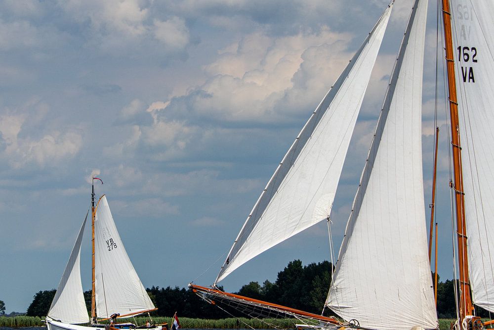 Historic sailboats under a typical Dutch sky on the Heegermeer in Friesland. Here we see two old ski huts. There is a lot of wind so all sails are full and the speed is high.