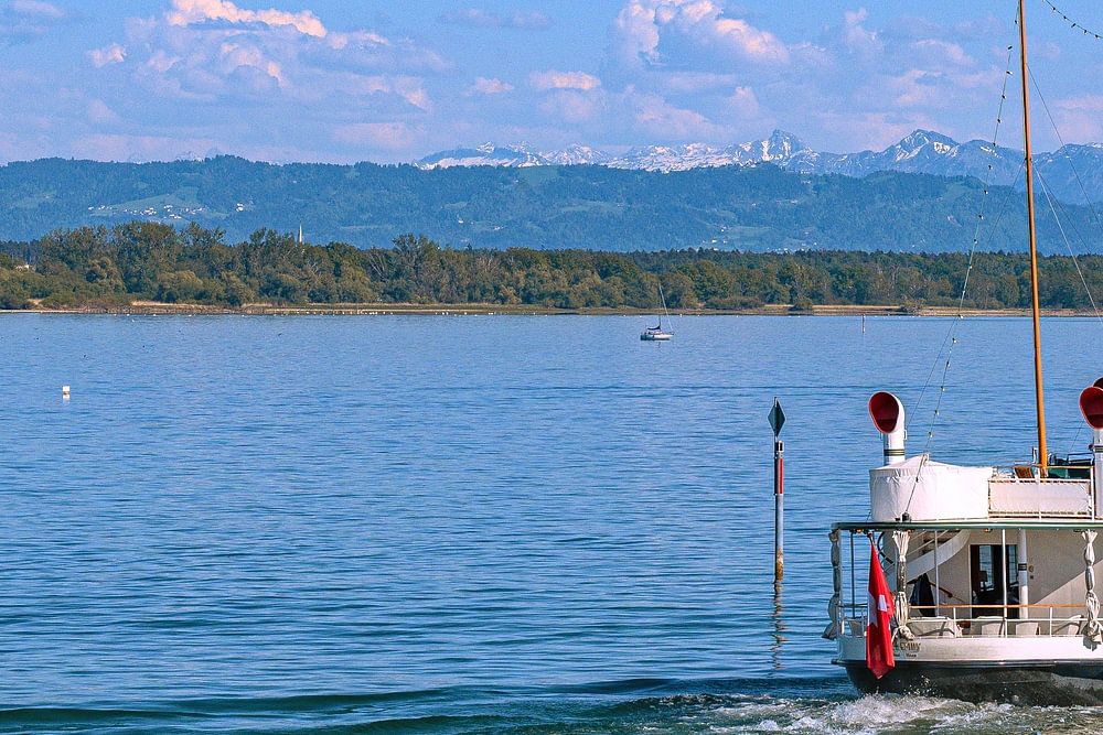 About "Historic steamboat on Lake Constance with a panoramic view of the Alps"