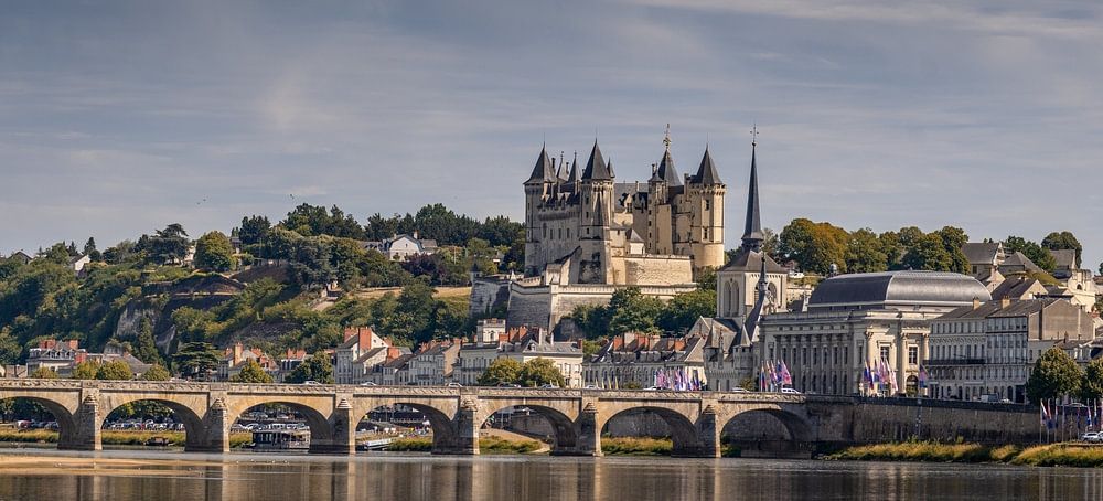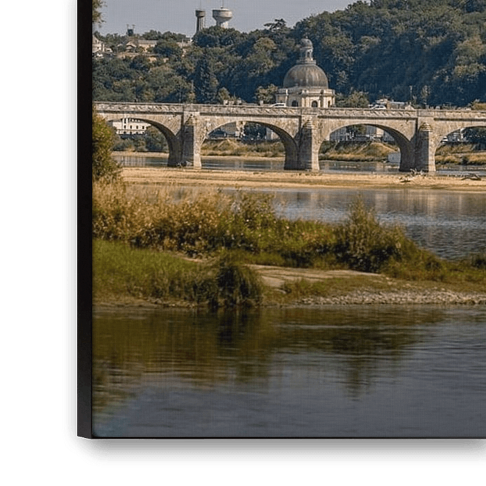 This picture shows a picturesque town on the Loire with an impressive bridge and a historic castle on a hill. The scenery is framed by the calm surface of the water and the surrounding nature, creating a harmonious and peaceful atmosphere. Perfect for themes such as travelling, culture, history and architecture. The image conveys a sense of tranquillity, timelessness and the beauty of classic European landscapes.