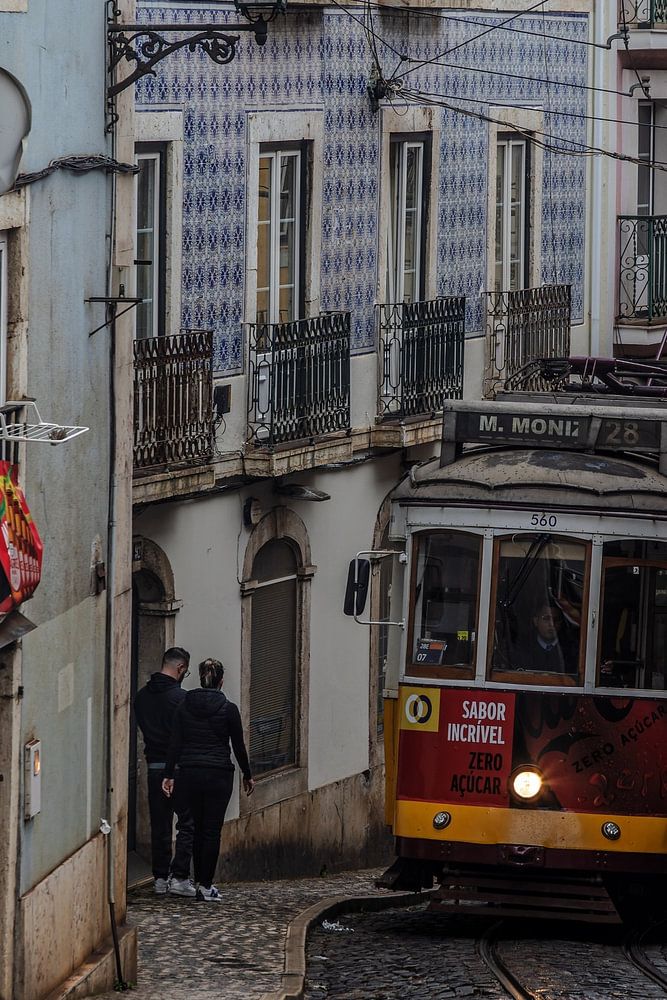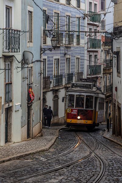 Historic tram of the famous line 28 on a rainy spring day in the historic centre of Lisbon, Portugal.