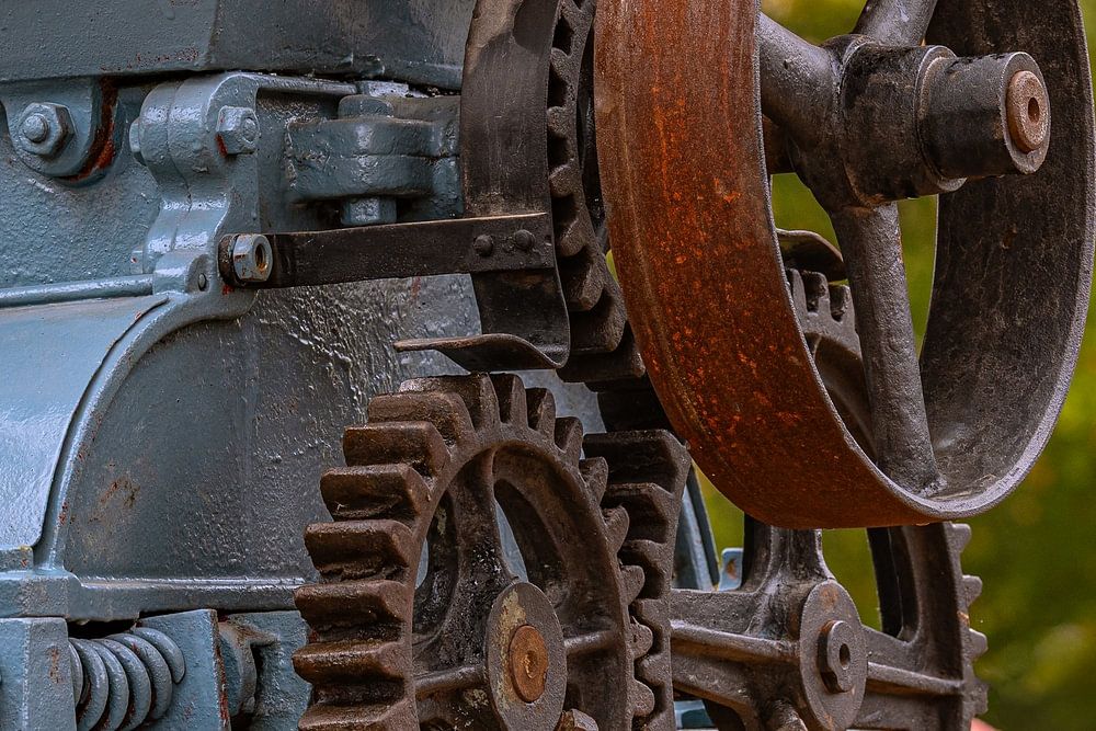 Historic cogwheels and a rusty flywheel form the centrepiece of this close-up of an old agricultural machine. This mechanical heritage is a characteristic element of the technical exhibitions at the Kaltblutmarkt in Laupheim.