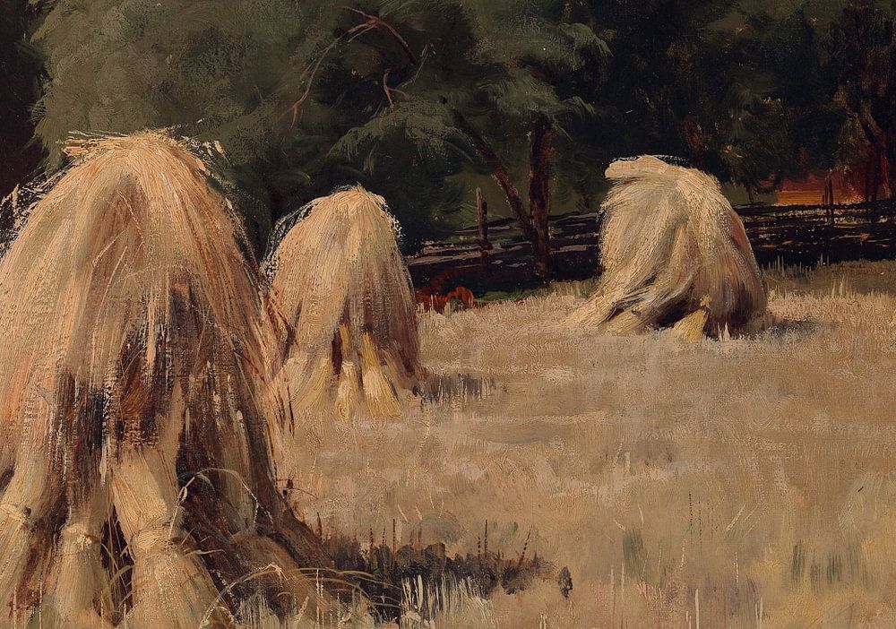 In the fall during harvest, the rye has been harvested and stands on sheaves to dry. A picture of the agricultural economy.