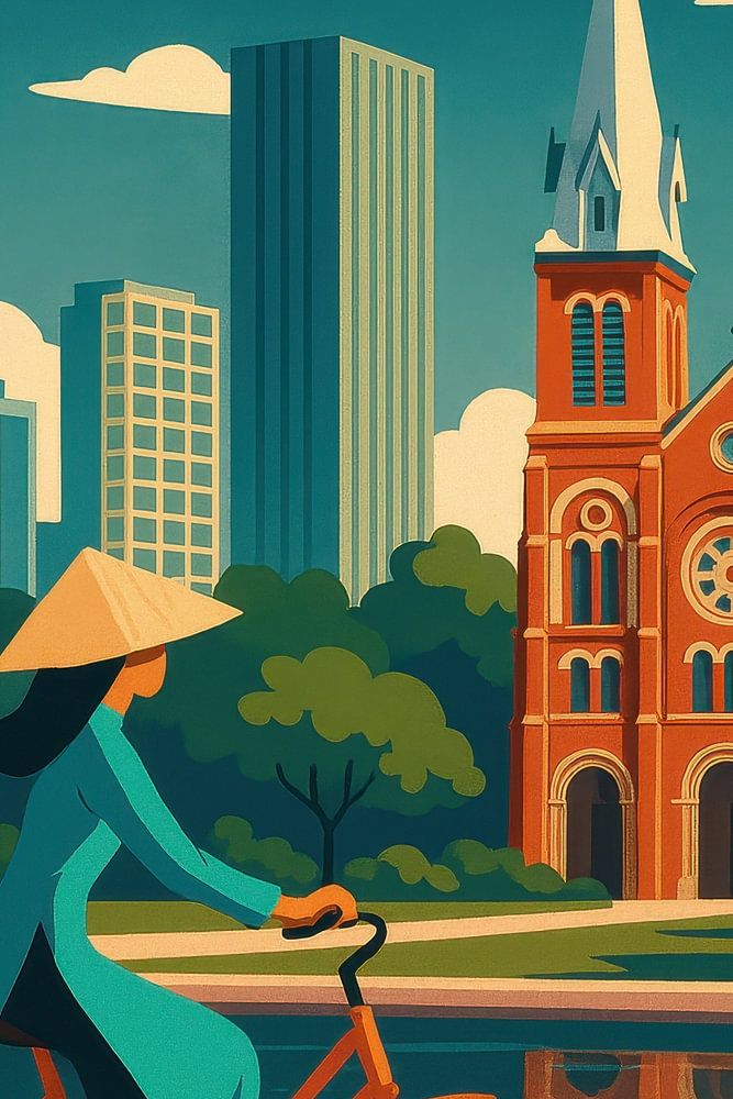 This lively scene transports you to the pulsating heart of Ho Chi Minh City. The harmonious combination of traditional and modern architectural elements is emphasised by the cycling figure in the elegant Ao Dai. Ideal for the living room, this picture brings a relaxed atmosphere and a touch of cultural flair to any room.