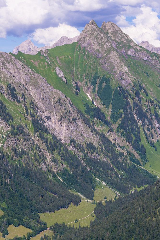 Panorama of the Himmelschrofen, 1759m, into the Dietersbachtal, behind the Höfats, 2259m, Allgäu Alps, Allgäu, Bavaria, Germany, Europe